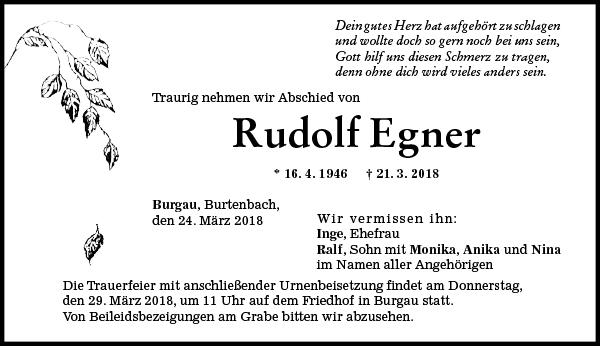Die Trauerfeier mit anschließender Urnenbeisetzung findet am Donnerstag, den 29. März 2018, um 11 Uhr auf dem Friedhof in Burgau statt.
