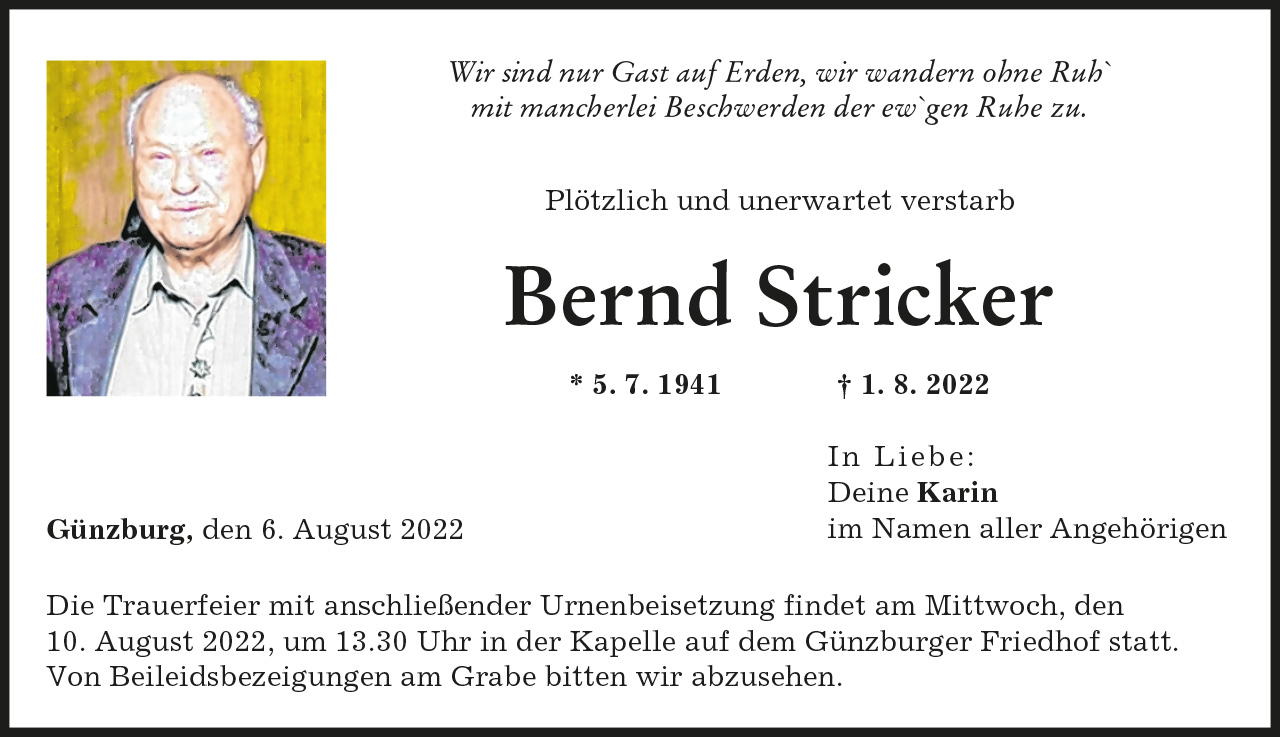 10. August 2022, um 13.30 Uhr in der Kapelle auf dem Günzburger Friedhof statt.