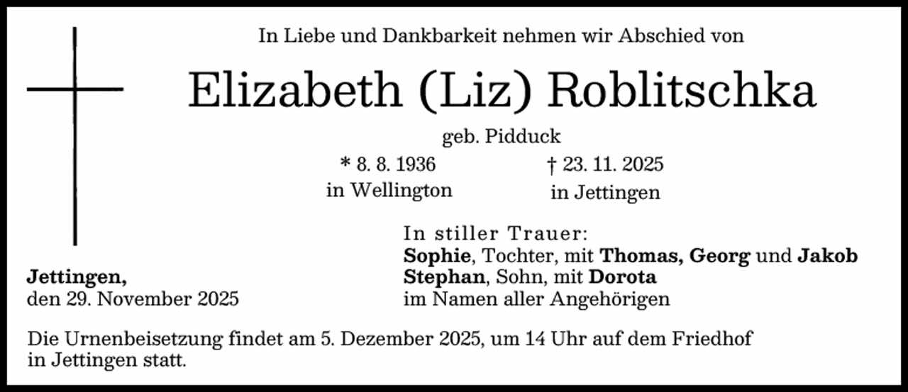 Die Urnenbeisetzung findet am 5. Dezember 2025, um 14 Uhr auf dem Friedhof in Jettingen statt.
